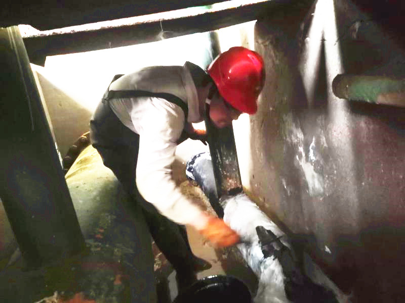 原鹵管線是采鹵崗位重要的組成部分,是停車必檢項(xiàng)之一。但是檢修難度不小,一是過道空間狹小,光線昏暗,一次僅夠兩個(gè)人同時(shí)作業(yè);二是檢修原鹵管線時(shí),必須“涉水”作業(yè)。檢修期間原鹵管線一閃一閃的焊光將周圍照亮,順著火花向里看去,只見有兩個(gè)人在狹小的空間綣著身子低頭忙活著,感覺身子都轉(zhuǎn)不開的樣子。他們像小貓似的蜷縮在兩邊,全身濕透,白色的工服也被銹漬染的亂起八糟,被油漬沁透成一坨一坨的,但他們堅(jiān)定的眼神、專注的神情卻叫人佩服。我不禁問道:“這么窄的空間人咋進(jìn)去。俊他們開玩笑的說:“用縮骨功!”