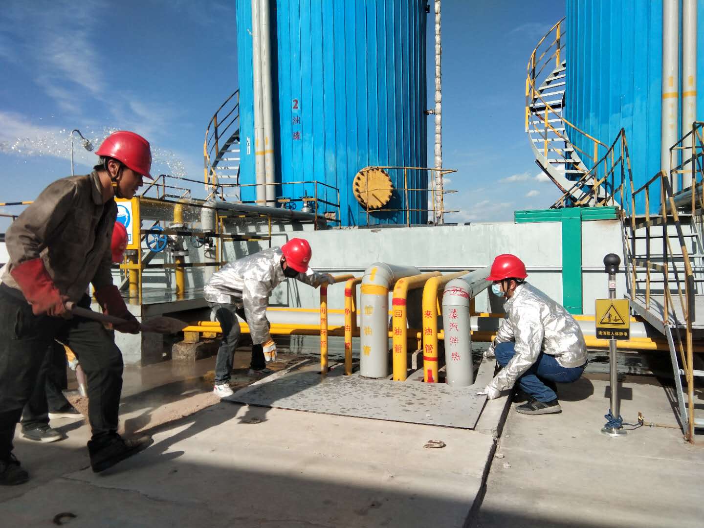 演練以維修工在焊接護(hù)欄時(shí)將焊渣掉入燃油庫房導(dǎo)流溝引起溝內(nèi)棉紗著火事故為主題,當(dāng)班調(diào)度接到崗位人員匯報(bào)后組織義務(wù)消防員對油罐、回油、來油、再循環(huán)管道進(jìn)行降溫,并匯報(bào)公司啟動(dòng)應(yīng)急處置預(yù)案進(jìn)行滅火的事故處置演練過程。