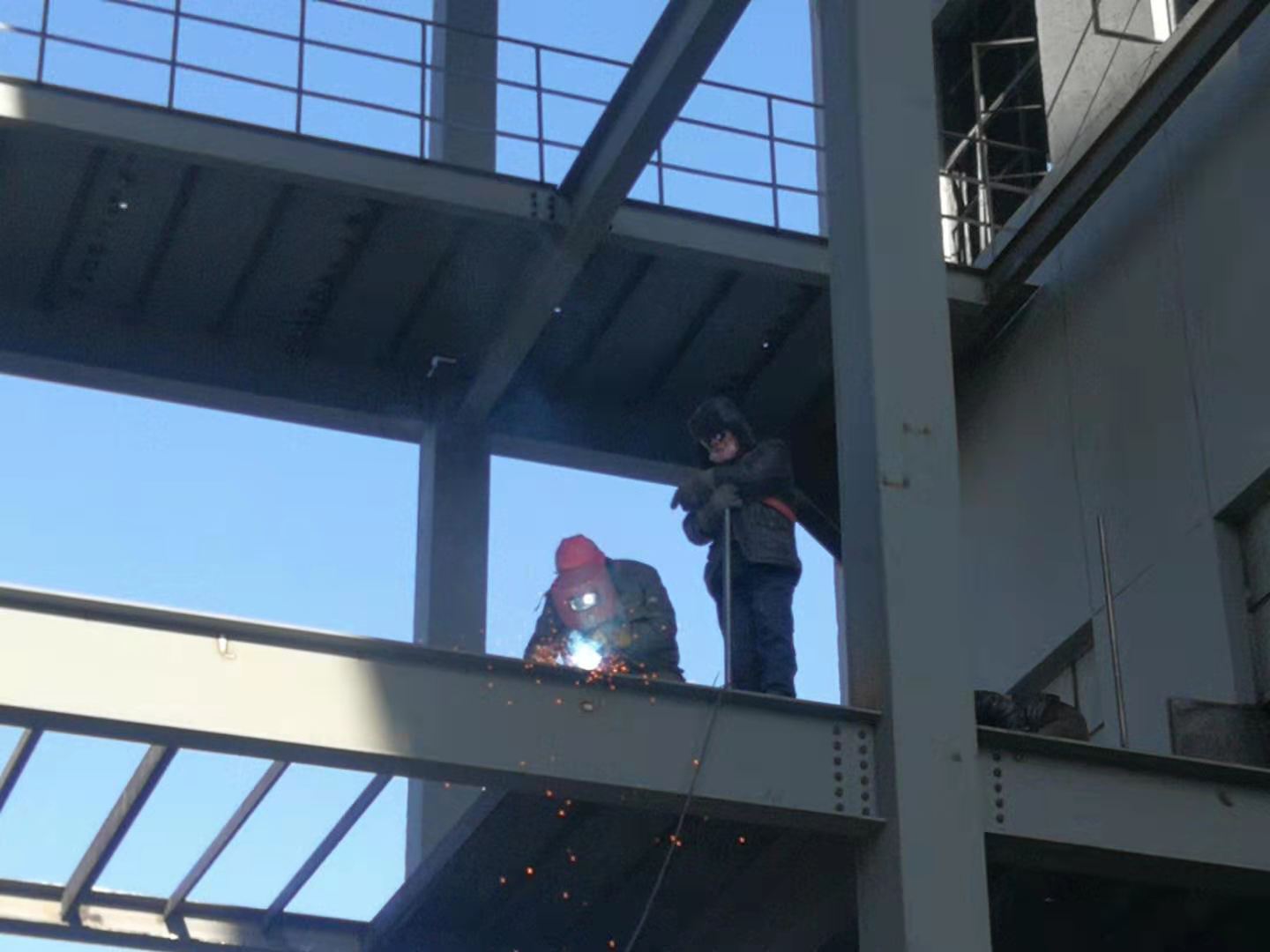 清晨的天,陰沉沉的。雖然跟前幾天比起來溫度有所回升,但呼呼的北風還是讓人感覺寒冷。走進技改現(xiàn)場,龐大的吊車正在吊裝作業(yè)。高高的原料輸送斜廊上幾個身影系著安全帶等待著彩板的到來。吊車旁邊的指揮者,穿著厚厚的棉襖,拿著對講機,高高的仰著頭在觀察吊物情況,確保吊裝過程的安全。我抬頭仰望,數(shù)十米高的平臺上,幾個身影若隱若現(xiàn),隱約能看到他們的安全帽在鋼結(jié)構(gòu)后面來回躍動。