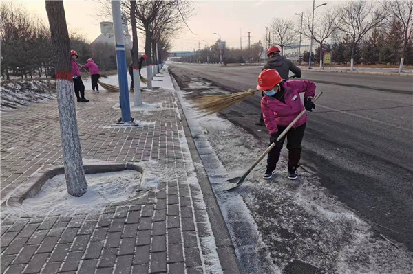 裝置門前的松樹上掛滿雪球看著調(diào)皮且可愛,九點(diǎn)過后太陽開始照射,遠(yuǎn)遠(yuǎn)望去整個(gè)廠區(qū)銀光閃閃,讓人移不開眼。雖然雪景美麗但因?yàn)槁访娣e雪會(huì)導(dǎo)致員工滑倒等危險(xiǎn),且廠區(qū)其他生產(chǎn)場(chǎng)地都需繼續(xù)生產(chǎn),不能因下雪而影響,所以在欣賞完雪景后的我們也開始了積雪大清掃活動(dòng)。
