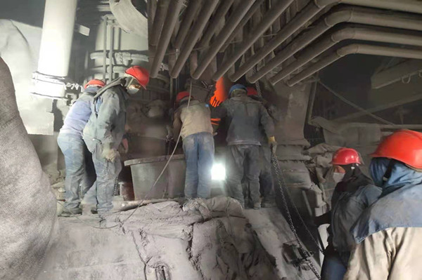 剛踏上平臺,首先映入筆者眼簾的,是一群穿著藍(lán)色牛仔工裝的工友們正在有序的拆卸二層爐面保溫材料準(zhǔn)備更換燒損下料柱。只見他們個個干勁十足、衣服早已被汗水浸濕、黑乎乎的臉看不清誰是誰?他們顧不得爐面余溫的熾熱、爐面積灰的刺鼻積極投入到檢修中,一時間吶喊聲、叉車鳴笛聲,起重吊車的口哨聲,聲聲作響,猶如一首交響樂響徹整個檢修現(xiàn)場!在大家的齊心協(xié)力下,燒損下料柱順利被拆下,并按時裝好!
