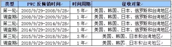 我國自2003 年開始對原產(chǎn)于美國、日本、韓國以及臺灣的PVC征收反傾銷稅。據(jù)商務(wù)部2018年第68號公告,商務(wù)部決定自2018年9月29日起,對原產(chǎn)于美國、韓國、日本和臺灣地區(qū)的進(jìn)口聚氯乙烯所適用的反傾銷措施進(jìn)行期終復(fù)審調(diào)查。調(diào)查自2018年9月29日起開始,于2019年9月28日前結(jié)束。如取消反傾銷稅,進(jìn)口可能增加,并沖擊國內(nèi)市場。
