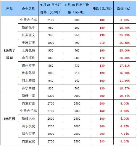 進(jìn)入9月,國內(nèi)燒堿市場終于打破7月以來的平衡狀態(tài),價(jià)格出現(xiàn)迅猛上漲走勢。截至9月25日,山東地區(qū)32%離子膜堿市場均價(jià)上漲135元/噸至800元/噸,漲幅為20.3%,內(nèi)蒙地區(qū)99%片堿上漲200元至2650元/噸,漲幅為8.16%。相比而言,片堿市場表現(xiàn)相對溫和,液堿市場則更顯迅猛。