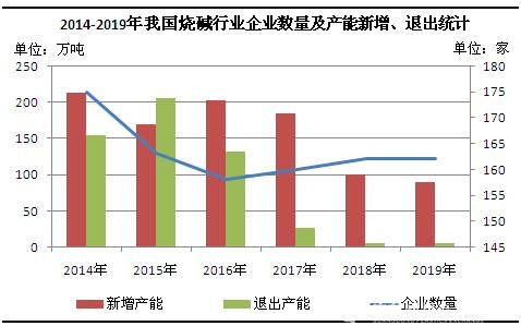 圖1 2014-2019年中國燒堿行業(yè)企業(yè)數(shù)量及產(chǎn)能新增、退出統(tǒng)計