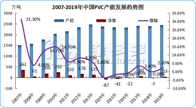2.1 2007年-2019年中國聚氯乙烯產能走勢圖