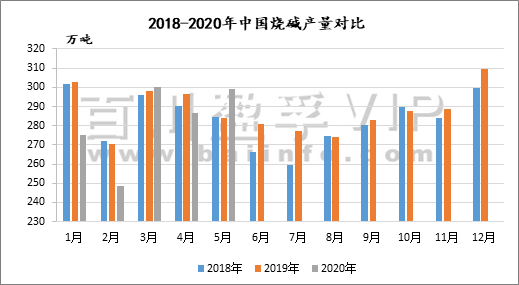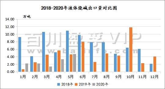 量上面,2020年1-5月中國(guó)液體燒堿共出口13.8萬(wàn)噸,相比于2019年1-5月出口量18.8萬(wàn)噸,下滑26.6%;