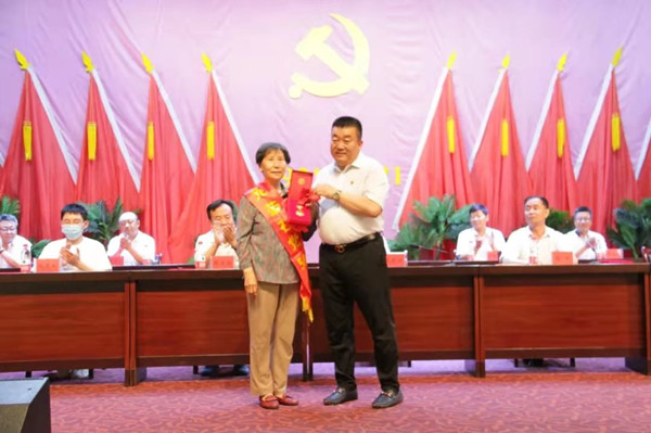 集團(tuán)公司黨委書記代良云同志向老黨員郭淑珍頒發(fā)“光榮在黨50年”紀(jì)念章